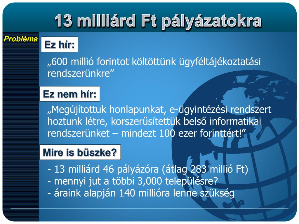 Probléma Ez hír: • „600 millió forintot költöttünk ügyféltájékoztatási rendszerünkre” • „Megújítottuk honlapunkat, e-ügyintézési rendszert hoztunk létre, korszerűsítettük belső informatikai rendszerünket – mindezt 100 ezer forinttért!” • 13 milliárd 46 pályázóra (átlag 283 millió Ft) • mennyi jut a többi 3,000 településre? • áraink alapján 140 millióra lenne szükség Ez nem hír: Mire is büszke?