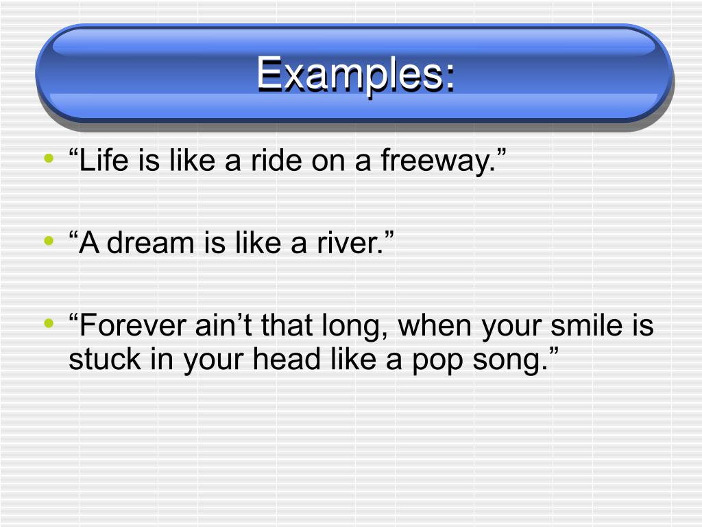 Examples: • “Life is like a ride on a freeway.” • “A dream is like a river.” • “Forever ain’t that long, when your smile is stuck in your head like a pop song.”