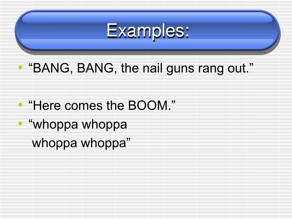 Examples: • “BANG, BANG, the nail guns rang out.” • “Here comes the BOOM.” • “whoppa whoppa whoppa whoppa”