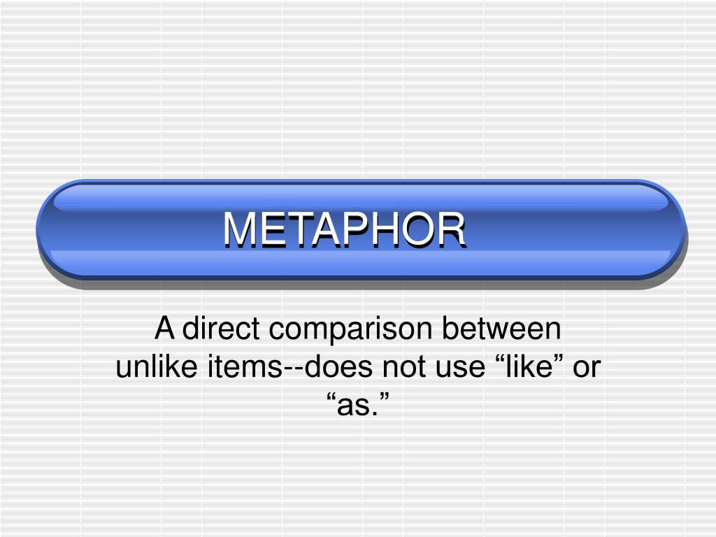 METAPHOR A direct comparison between unlike items--does not use “like” or “as.”