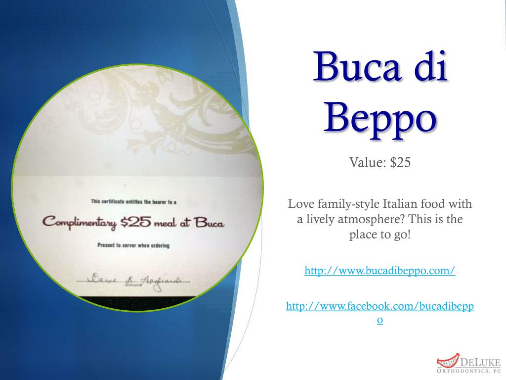 BucadiBeppo Value: $25 Love family-style Italian food with a lively atmosphere? This is the place to go! http://www.bucadibeppo.com/ http://www.facebook.com/bucadibeppo