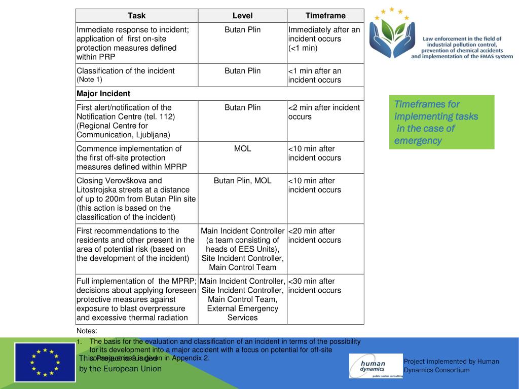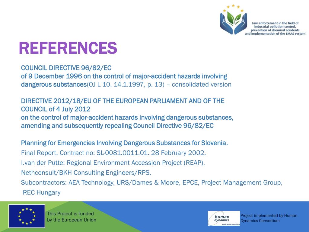 References COUNCIL DIRECTIVE 96/82/EC of 9 December 1996 on the control of major-accident hazards involving dangerous substances(OJ L 10, 14.1.1997, p. 13) – consolidated version DIRECTIVE 2012/18/EU OF THE EUROPEAN PARLIAMENT AND OF THE COUNCIL of 4 July 2012 on the control of major-accident hazards involving dangerous substances, amending and subsequently repealing Council Directive 96/82/EC Planning for Emergencies Involving Dangerous Substances for Slovenia. Final Report. Contract no: SL-0081.0011.01. 28 February 2002. I.van der Putte: Regional Environment Accession Project (REAP). Nethconsult/BKH Consulting Engineers/RPS. Subcontractors: AEA Technology, URS/Dames & Moore, EPCE, Project Management Group, REC Hungary