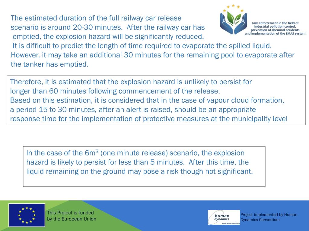 The estimated duration of the full railway car release scenario is around 20-30 minutes. After the railway car has emptied, the explosion hazard will be significantly reduced. It is difficult to predict the length of time required to evaporate the spilled liquid. However, it may take an additional 30 minutes for the remaining pool to evaporate after the tanker has emptied. Therefore, it is estimated that the explosion hazard is unlikely to persist for longer than 60 minutes following commencement of the release. Based on this estimation, it is considered that in the case of vapour cloud formation, a period 15 to 30 minutes, after an alert is raised, should be an appropriate response time for the implementation of protective measures at the municipality level In the case of the 6m3 (one minute release) scenario, the explosion hazard is likely to persist for less than 5 minutes. After this time, the liquid remaining on the ground may pose a risk though not significant.