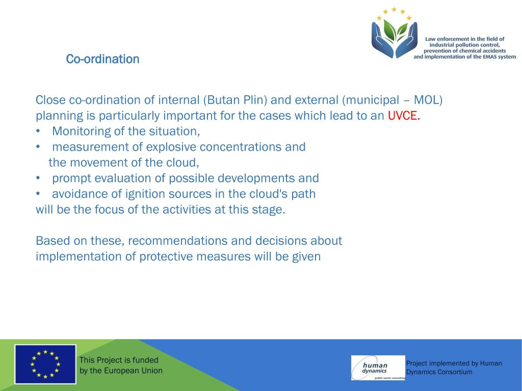 Co-ordination • Close co-ordination of internal (ButanPlin) and external (municipal – MOL) • planning is particularly important for the cases which lead to an UVCE. • Monitoring of the situation, • measurement of explosive concentrations and • the movement of the cloud, • prompt evaluation of possible developments and • avoidance of ignition sources in the cloud's path • will be the focus of the activities at this stage. • Based on these, recommendations and decisions about • implementation of protective measures will be given