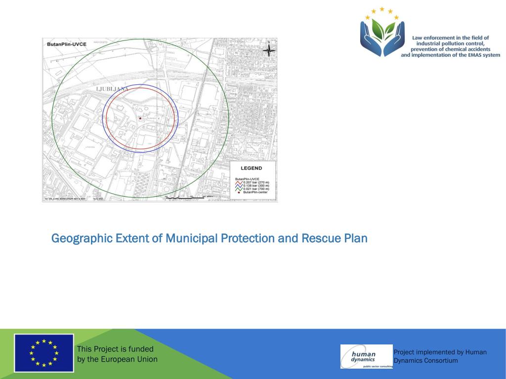 This document outlines the Internal Emergency Response Plan (IERP) for ButanPlin, funded by the European Union. It addresses potential emergency scenarios related to LPG releases at the ButanPlin facility in Šiška, Ljubljana. Key potential incidents include jet fires, pool fires, and vapor cloud explosions, with a focus on injury prevention and damage mitigation. The plan defines on-site and municipal emergency response strategies, expected hazards, and spatial impact assessments, ensuring readiness for various release scenarios.