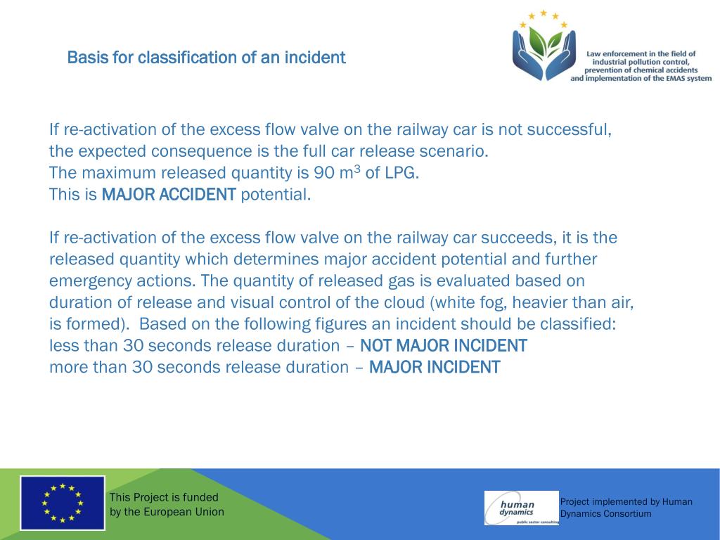 Basis for classification of an incident • If re-activation of the excess flow valve on the railway car is not successful, • the expected consequence is the full car release scenario. • The maximum released quantity is 90 m3 of LPG. • This is MAJOR ACCIDENT potential. • If re-activation of the excess flow valve on the railway car succeeds, it is the • released quantity which determines major accident potential and further • emergency actions. The quantity of released gas is evaluated based on • duration of release and visual control of the cloud (white fog, heavier than air, • is formed). Based on the following figures an incident should be classified: • less than 30 seconds release duration – NOT MAJOR INCIDENT • more than 30 seconds release duration – MAJOR INCIDENT