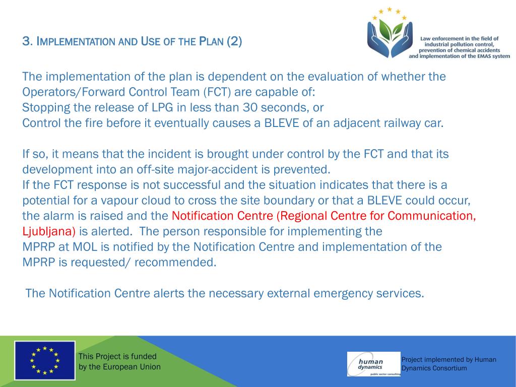 3. Implementation and Use of the Plan (2) • The implementation of the plan is dependent on the evaluation of whether the • Operators/Forward Control Team (FCT) are capable of: • Stopping the release of LPG in less than 30 seconds, or • Control the fire before it eventually causes a BLEVE of an adjacent railway car. • If so, it means that the incident is brought under control by the FCT and that its • development into an off-site major-accident is prevented. • If the FCT response is not successful and the situation indicates that there is a • potential for a vapour cloud to cross the site boundary or that a BLEVE could occur, • the alarm is raised and the Notification Centre (Regional Centre for Communication, • Ljubljana) is alerted. The person responsible for implementing the • MPRP at MOL is notified by the Notification Centre and implementation of the • MPRP is requested/ recommended. • The Notification Centre alerts the necessary external emergency services.