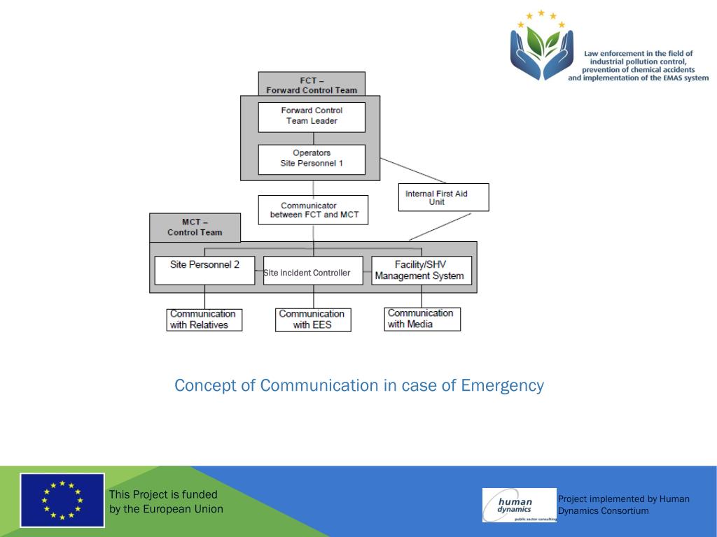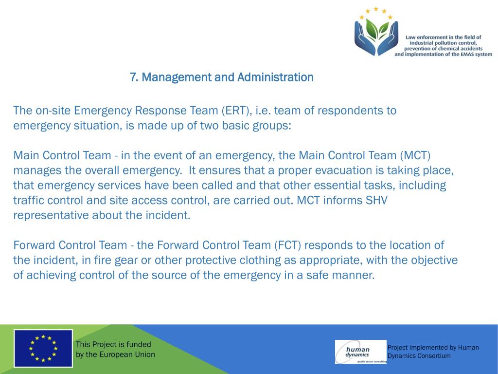 7. Management and Administration • The on-site Emergency Response Team (ERT), i.e. team of respondents to • emergency situation, is made up of two basic groups: • Main Control Team - in the event of an emergency, the Main Control Team (MCT) • manages the overall emergency. It ensures that a proper evacuation is taking place, • that emergency services have been called and that other essential tasks, including • traffic control and site access control, are carried out. MCT informs SHV • representative about the incident. • Forward Control Team - the Forward Control Team (FCT) responds to the location of • the incident, in fire gear or other protective clothing as appropriate, with the objective • of achieving control of the source of the emergency in a safe manner.