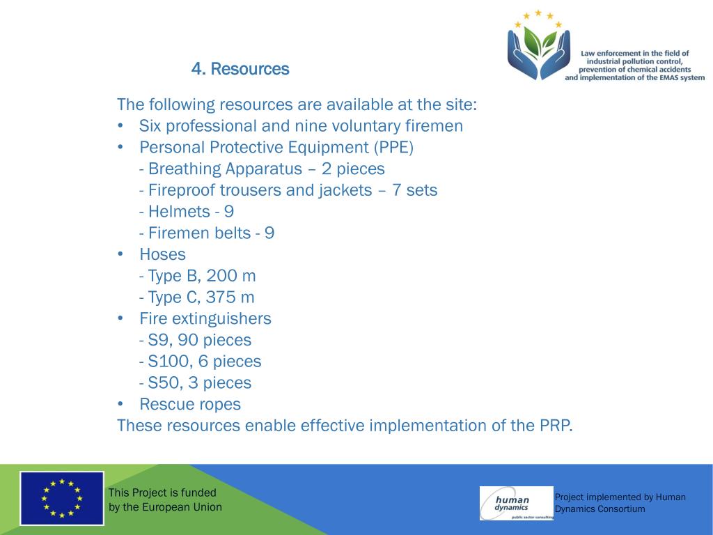 4. Resources • The following resources are available at the site: • Six professional and nine voluntary firemen • Personal Protective Equipment (PPE) • - Breathing Apparatus – 2 pieces • - Fireproof trousers and jackets – 7 sets • - Helmets - 9 • - Firemen belts - 9 • Hoses • - Type B, 200 m • - Type C, 375 m • Fire extinguishers • - S9, 90 pieces • - S100, 6 pieces • - S50, 3 pieces • Rescue ropes • These resources enable effective implementation of the PRP.