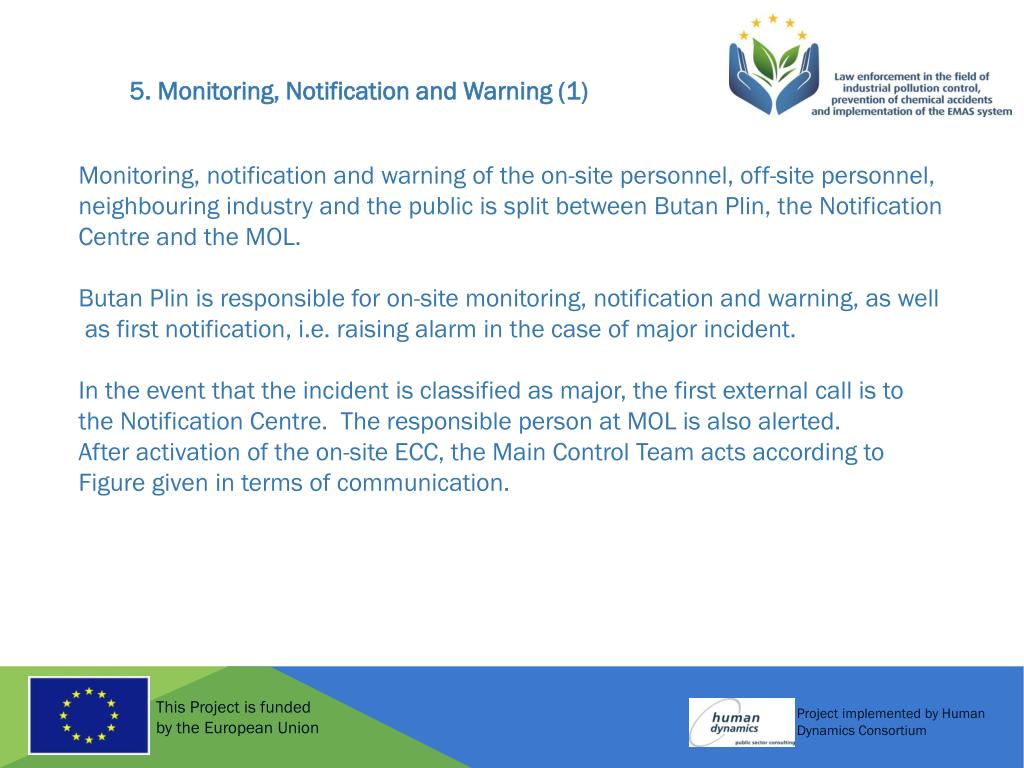 5. Monitoring, Notification and Warning (1) Monitoring, notification and warning of the on-site personnel, off-site personnel, neighbouring industry and the public is split between ButanPlin, the Notification Centre and the MOL. ButanPlin is responsible for on-site monitoring, notification and warning, as well as first notification, i.e. raising alarm in the case of major incident. In the event that the incident is classified as major, the first external call is to the Notification Centre. The responsible person at MOL is also alerted. After activation of the on-site ECC, the Main Control Team acts according to Figure given in terms of communication.