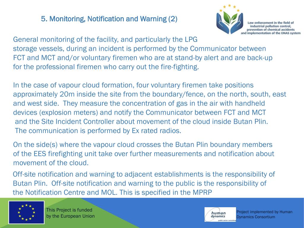 5. Monitoring, Notification and Warning (2) General monitoring of the facility, and particularly the LPG storage vessels, during an incident is performed by the Communicator between FCT and MCT and/or voluntary firemen who are at stand-by alert and are back-up for the professional firemen who carry out the fire-fighting. In the case of vapour cloud formation, four voluntary firemen take positions approximately 20m inside the site from the boundary/fence, on the north, south, east and west side. They measure the concentration of gas in the air with handheld devices (explosion meters) and notify the Communicator between FCT and MCT and the Site Incident Controller about movement of the cloud inside ButanPlin. The communication is performed by Ex rated radios. On the side(s) where the vapour cloud crosses the ButanPlin boundary members of the EES firefighting unit take over further measurements and notification about movement of the cloud. Off-site notification and warning to adjacent establishments is the responsibility of ButanPlin. Off-site notification and warning to the public is the responsibility of the Notification Centre and MOL. This is specified in the MPRP