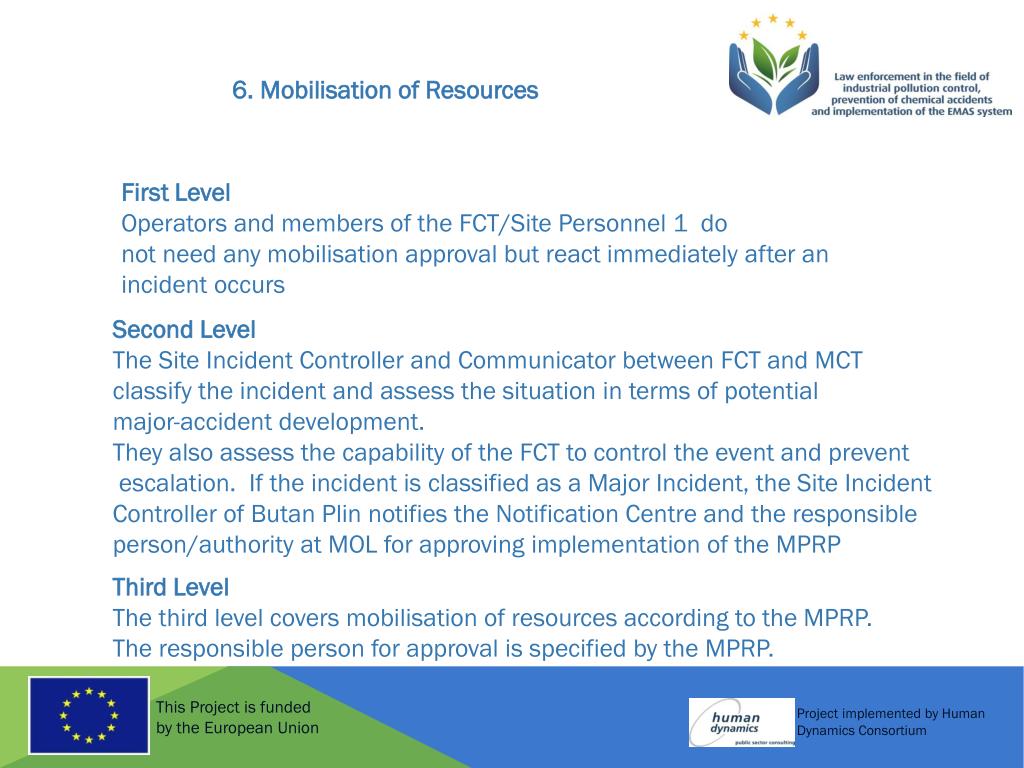 6. Mobilisation of Resources First Level Operators and members of the FCT/Site Personnel 1 do not need any mobilisation approval but react immediately after an incident occurs • Second Level • The Site Incident Controller and Communicator between FCT and MCT • classify the incident and assess the situation in terms of potential • major-accident development. • They also assess the capability of the FCT to control the event and prevent • escalation. If the incident is classified as a Major Incident, the Site Incident • Controller of ButanPlin notifies the Notification Centre and the responsible • person/authority at MOL for approving implementation of the MPRP • Third Level • The third level covers mobilisation of resources according to the MPRP. • The responsible person for approval is specified by the MPRP.