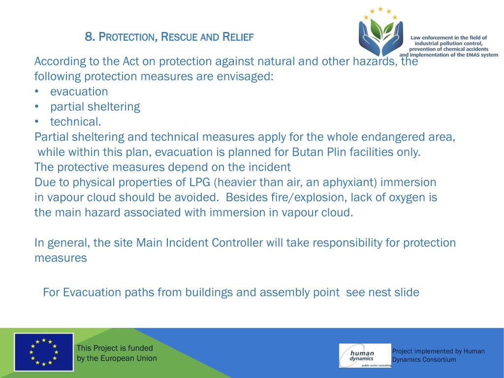 8. Protection, Rescue and Relief • According to the Act on protection against natural and other hazards, the • following protection measures are envisaged: • evacuation • partial sheltering • technical. • Partial sheltering and technical measures apply for the whole endangered area, • while within this plan, evacuation is planned for ButanPlin facilities only. • The protective measures depend on the incident • Due to physical properties of LPG (heavier than air, an aphyxiant) immersion • in vapour cloud should be avoided. Besides fire/explosion, lack of oxygen is • the main hazard associated with immersion in vapour cloud. • In general, the site Main Incident Controller will take responsibility for protection • measures For Evacuation paths from buildings and assembly point see nest slide
