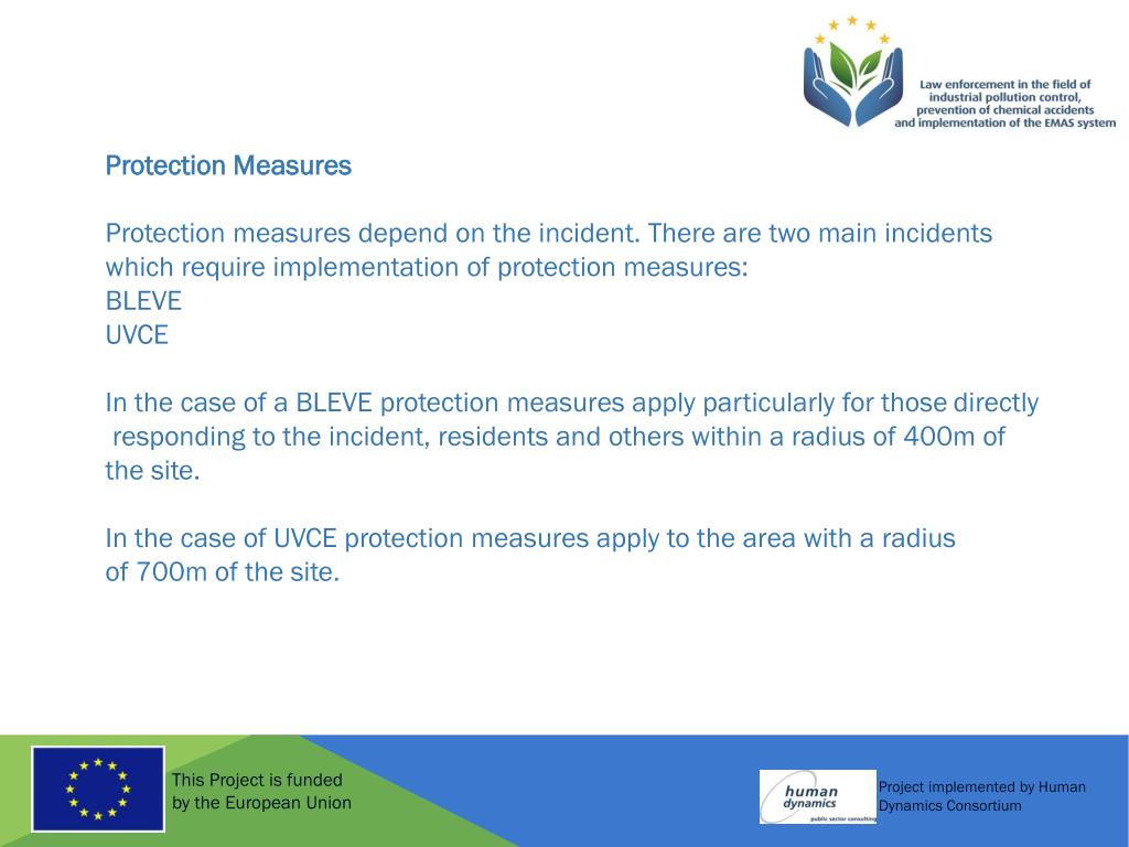 Protection Measures • Protection measures depend on the incident. There are two main incidents • which require implementation of protection measures: • BLEVE • UVCE • In the case of a BLEVE protection measures apply particularly for those directly • responding to the incident, residents and others within a radius of 400m of • the site. • In the case of UVCE protection measures apply to the area with a radius • of 700m of the site.
