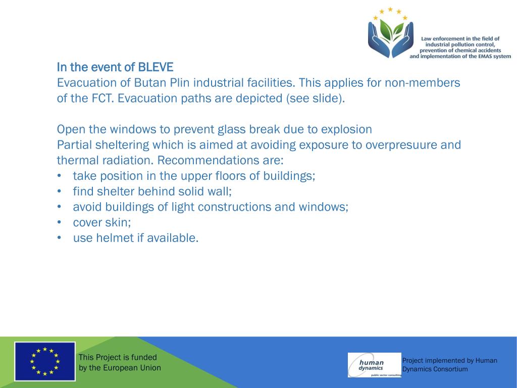 In the event of BLEVE • Evacuation of Butan Plin industrial facilities. This applies for non-members • of the FCT. Evacuation paths are depicted (see slide). • Open the windows to prevent glass break due to explosion • Partial sheltering which is aimed at avoiding exposure to overpresuure and • thermal radiation. Recommendations are: • take position in the upper floors of buildings; • find shelter behind solid wall; • avoid buildings of light constructions and windows; • cover skin; • use helmet if available.