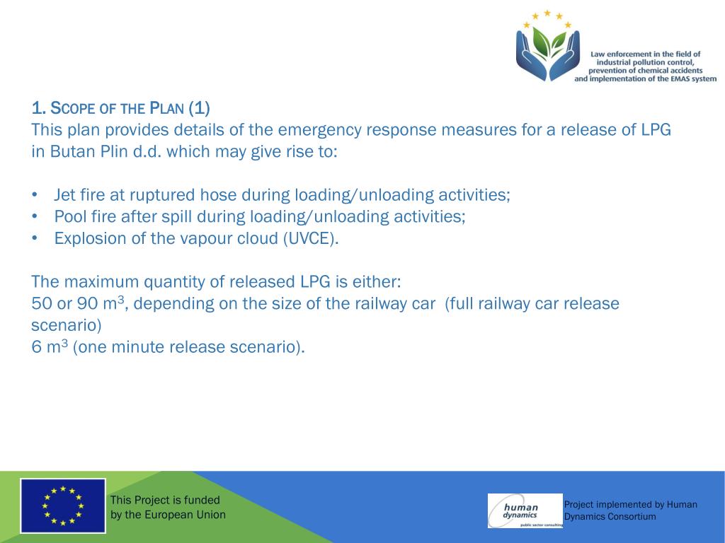 1. Scope of the Plan (1) • This plan provides details of the emergency response measures for a release of LPG in ButanPlind.d. which may give rise to: • Jet fire at ruptured hose during loading/unloading activities; • Pool fire after spill during loading/unloading activities; • Explosion of the vapour cloud (UVCE). • The maximum quantity of released LPG is either: • 50 or 90 m3, depending on the size of the railway car (full railway car release scenario) • 6 m3 (one minute release scenario).