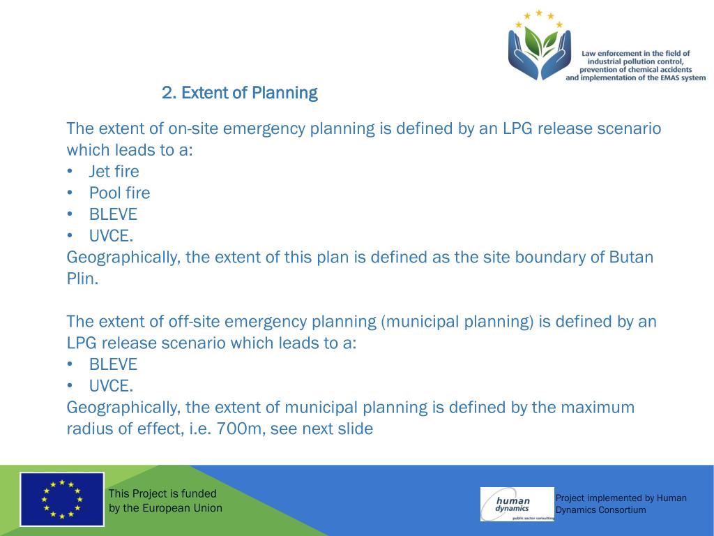 2. Extent of Planning • The extent of on-site emergency planning is defined by an LPG release scenario which leads to a: • Jet fire • Pool fire • BLEVE • UVCE. • Geographically, the extent of this plan is defined as the site boundary of ButanPlin. • The extent of off-site emergency planning (municipal planning) is defined by an LPG release scenario which leads to a: • BLEVE • UVCE. • Geographically, the extent of municipal planning is defined by the maximum radius of effect, i.e. 700m, see next slide
