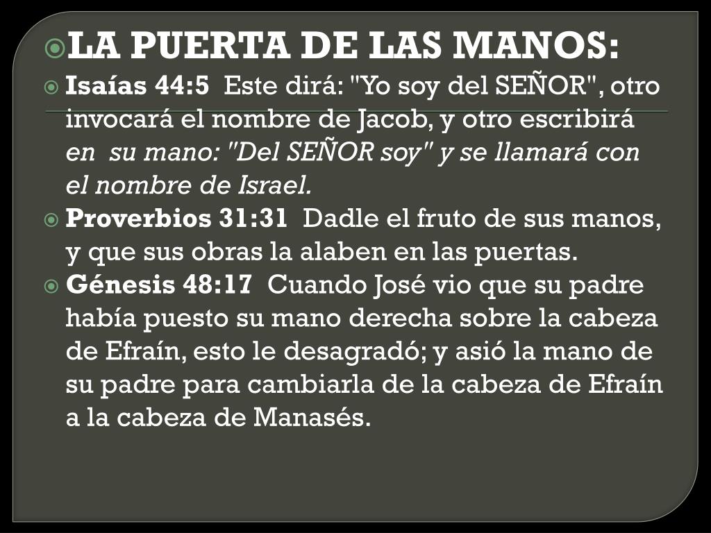 LA PUERTA DE LAS MANOS: Isaías 44:5 Este dirá: "Yo soy del SEÑOR", otro invocará el nombre de Jacob, y otro escribirá en su mano: "Del SEÑOR soy" y se llamará con el nombre de Israel. Proverbios 31:31 Dadle el fruto de sus manos, y que sus obras la alaben en las puertas. Génesis 48:17 Cuando José vio que su padre había puesto su mano derecha sobre la cabeza de Efraín, esto le desagradó; y asió la mano de su padre para cambiarla de la cabeza de Efraín a la cabeza de Manasés.