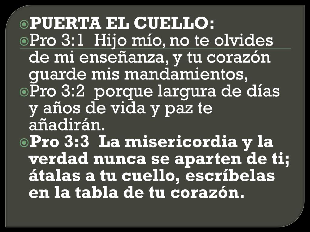 PUERTA EL CUELLO: Pro 3:1 Hijo mío, no te olvides de mi enseñanza, y tu corazón guarde mis mandamientos, Pro 3:2 porque largura de días y años de vida y paz te añadirán. Pro 3:3 La misericordia y la verdad nunca se aparten de ti; átalas a tu cuello, escríbelas en la tabla de tu corazón.