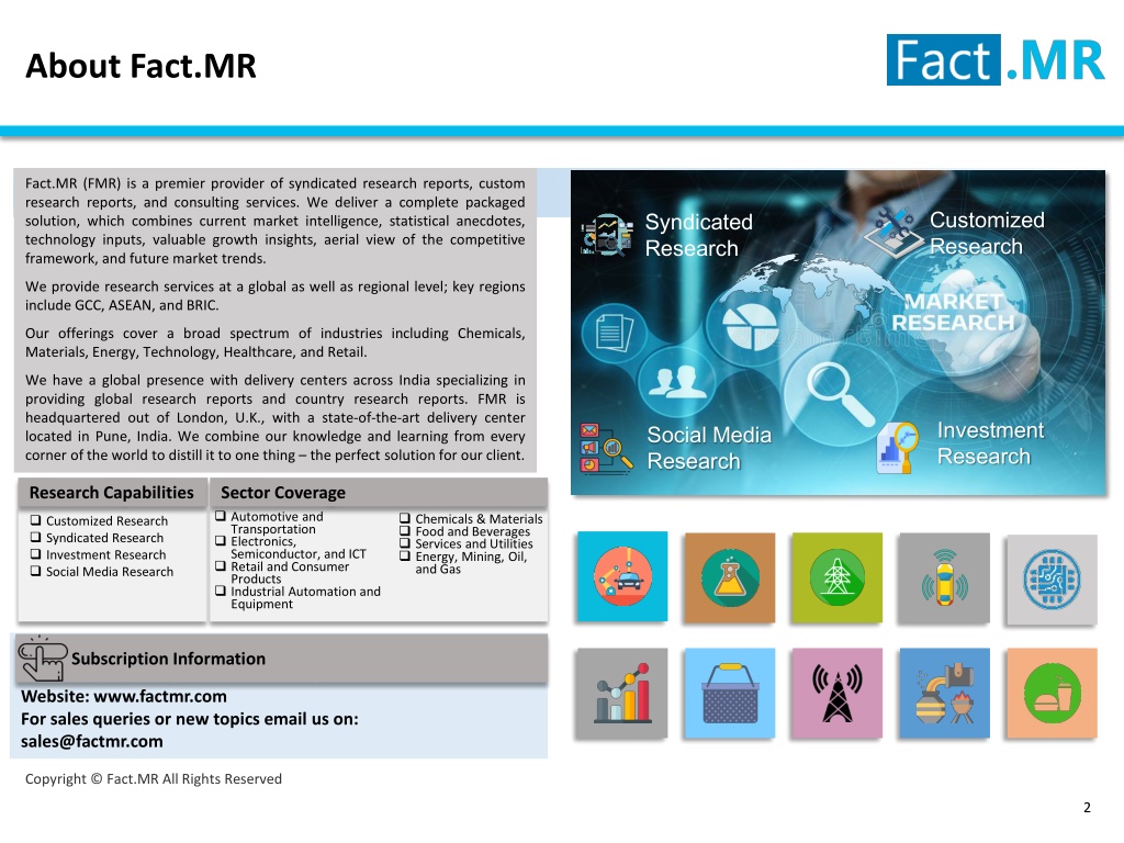 About Fact.MR Fact.MR (FMR) is a premier provider of syndicated research reports, custom research reports, and consulting services. We deliver a complete packaged solution, which combines current market intelligence, statistical anecdotes, technology inputs, valuable growth insights, aerial view of the competitive framework, and future market trends. We provide research services at a global as well as regional level; key regions include GCC, ASEAN, and BRIC. Our offerings cover a broad spectrum of industries including Chemicals, Materials, Energy, Technology, Healthcare, and Retail. We have a global presence with delivery centers across India specializing in providing global research reports and country research reports. FMR is headquartered out of London, U.K., with a state-of-the-art delivery center located in Pune, India. We combine our knowledge and learning from every corner of the world to distill it to one thing – the perfect solution for our client. Social Media Research Customized Research Syndicated Research Investment Research Research Capabilities Sector Coverage • Automotive and Transportation • Electronics, Semiconductor, and ICT • Retail and Consumer Products • Industrial Automation and Equipment • Customized Research • Syndicated Research • Investment Research • Social Media Research • Chemicals & Materials • Food and Beverages • Services and Utilities • Energy, Mining, Oil, and Gas For detailed subscription information please contact Website: www.factmr.com For sales queries or new topics email us on: sales@factmr.com Subscription Information Copyright © Fact.MR All Rights Reserved