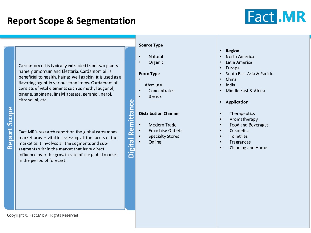 Report Scope & Segmentation Cardamom oil is typically extracted from two plants namely amomum and Elettaria. Cardamom oil is beneficial to health, hair as well as skin. It is used as a flavoring agent in various food items. Cardamom oil consists of vital elements such as methyl eugenol, pinene, sabinene, linalyl acetate, geraniol, nerol, citronellol, etc. Fact.MR’s research report on the global cardamom market proves vital in assessing all the facets of the market as it involves all the segments and sub-segments within the market that have direct influence over the growth rate of the global market in the period of forecast. Report Scope Digital Remittance Copyright © Fact.MR All Rights Reserved