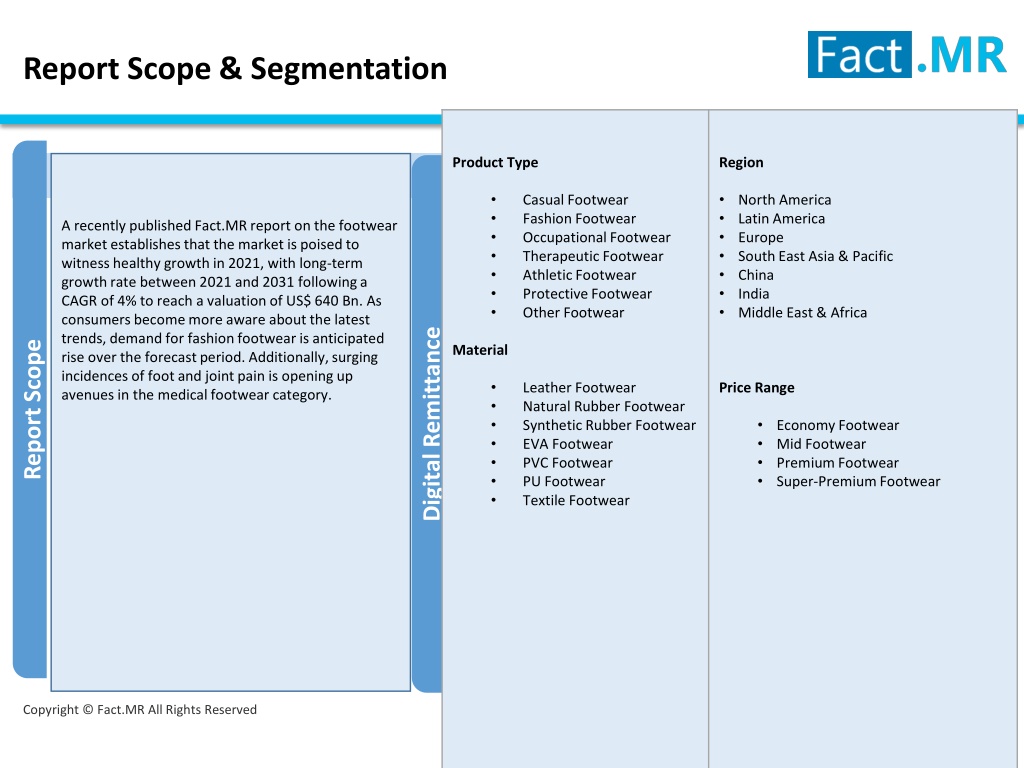 Report Scope & Segmentation A recently published Fact.MR report on the footwear market establishes that the market is poised to witness healthy growth in 2021, with long-term growth rate between 2021 and 2031 following a CAGR of 4% to reach a valuation of US$ 640 Bn. As consumers become more aware about the latest trends, demand for fashion footwear is anticipated rise over the forecast period. Additionally, surging incidences of foot and joint pain is opening up avenues in the medical footwear category. Report Scope Digital Remittance Copyright © Fact.MR All Rights Reserved