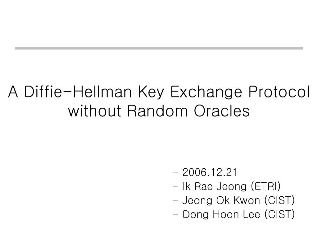 A Diffie-Hellman Key Exchange Protocol without Random Oracles. - 2006.12.21 - Ik Rae Jeong (ETRI) Jeong Ok Kwon (CIST) Dong Hoon Lee (CIST). Again Diffie-Hellman ?. Diffie-Hellman : 90 Diffie-Hellman key : 27 Diffie-Hellman key exchange : 11 Diffie-Hellman key exchange protocol : 1.