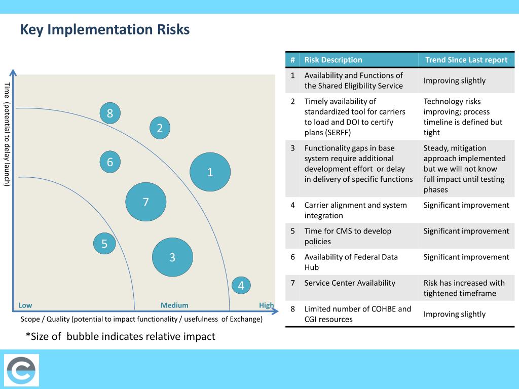 Key Implementation Risks 8 2 Time (potential to delay launch) 6 1 7 5 3 4 Low Medium High Scope / Quality (potential to impact functionality / usefulness of Exchange) *Size of bubble indicates relative impact