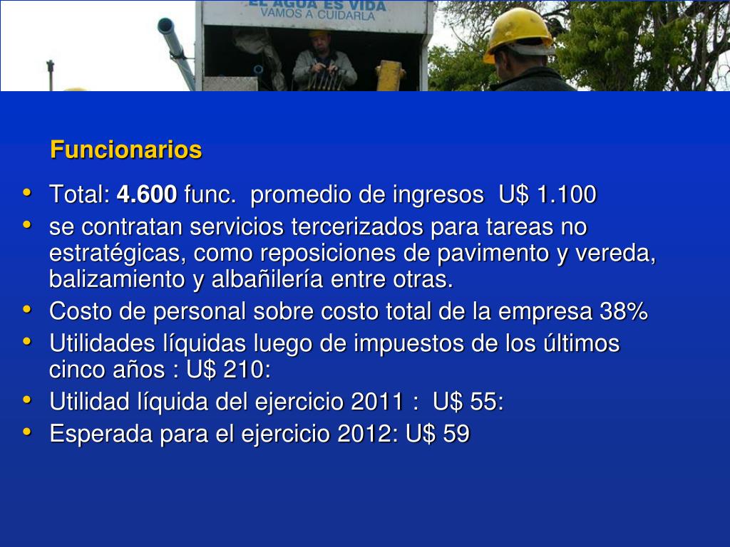 Funcionarios • Total: 4.600 func. promedio de ingresos U$ 1.100 • se contratan servicios tercerizados para tareas no estratégicas, como reposiciones de pavimento y vereda, balizamiento y albañilería entre otras. • Costo de personal sobre costo total de la empresa 38% • Utilidades líquidas luego de impuestos de los últimos cinco años : U$ 210: • Utilidad líquida del ejercicio 2011 : U$ 55: • Esperada para el ejercicio 2012: U$ 59