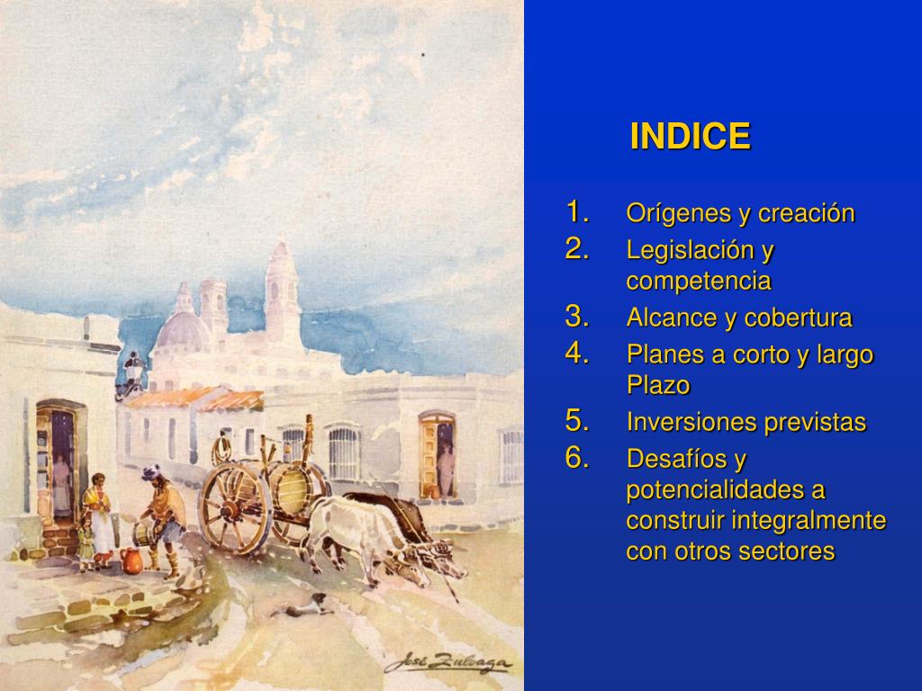 INDICE • Orígenes y creación • Legislación y competencia • Alcance y cobertura • Planes a corto y largo Plazo • Inversiones previstas • Desafíos y potencialidades a construir integralmente con otros sectores