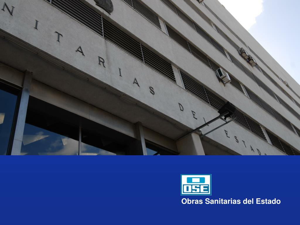 Presentación OSE es el organismo estatal responsable del abastecimiento de agua potable en todo el país y del servicio de saneamiento con excepción de Montevideo. • 4600 funcionarios en 70 locales comerciales • 14.722 km. de redes de agua potable. • 330.000.000 m3 de agua producida por año. • 98% de cobertura (población nucleada de todo el país) • 2.966 km. de redes de saneamiento. • 40% de cobertura (población nucleada del interior) • No recibe subsidios externos. • Se financia únicamente con sus ingresos por tarifa • (0,92% del ingreso medio familiar). • • Ingresos operativos 2011 : U$S 355.000.000 • • Inversión 2011: U$S 125.000.000 • • Resultados del ejercicio 2011: U$S 55.000.000