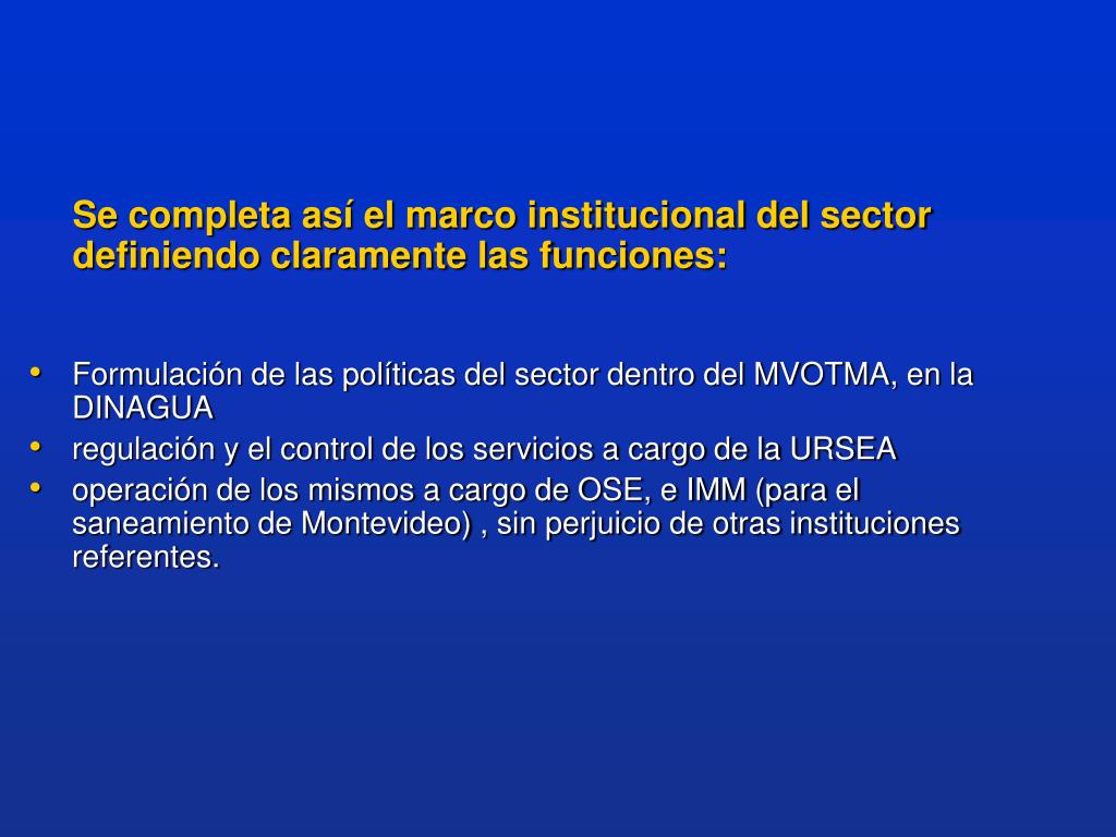 Se completa así el marco institucional del sector definiendo claramente las funciones: • Formulación de las políticas del sector dentro del MVOTMA, en la DINAGUA • regulación y el control de los servicios a cargo de la URSEA • operación de los mismos a cargo de OSE, e IMM (para el saneamiento de Montevideo) , sin perjuicio de otras instituciones referentes.