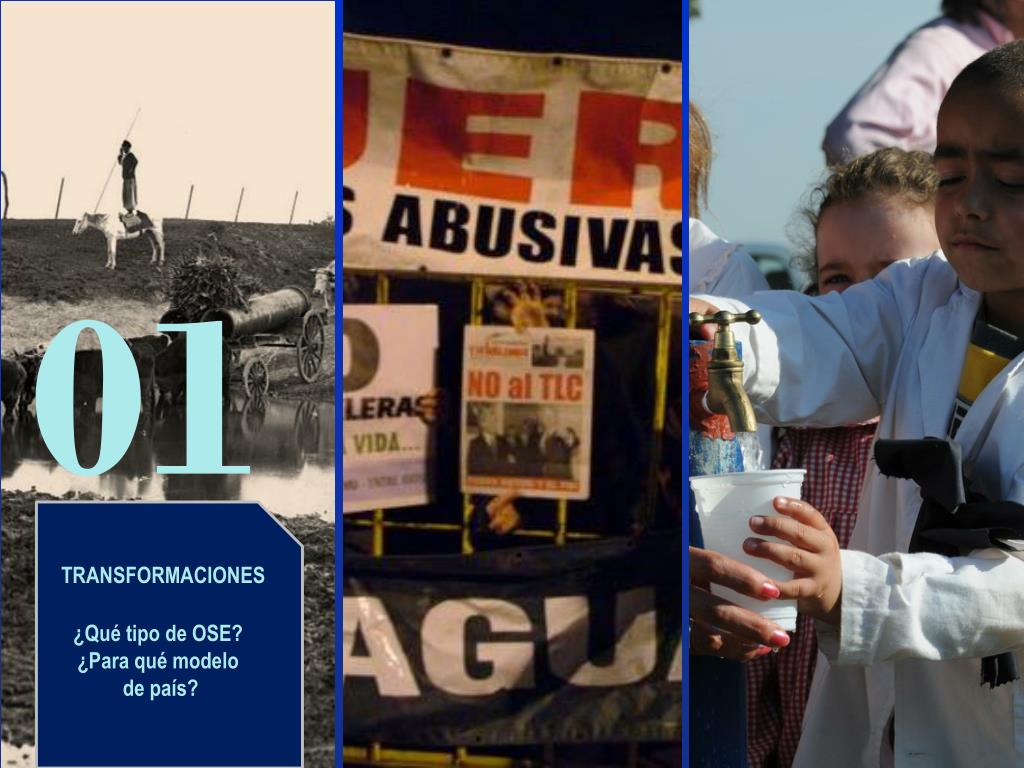 01 Transformaciones Principios década 2000 Gobierno asume gestión pública Defensa de los servicios prioritarios “Mejor estado y mejor mercado” 2004 El 64,7% de los ciudadanos a favor de una reforma constitucional: Uruguay: primer país en el mundo en declarar el acceso al agua y al saneamiento como derechos humanos fundamentales. Así mismo, la gestión será prestada exclusivamente por el Estado.