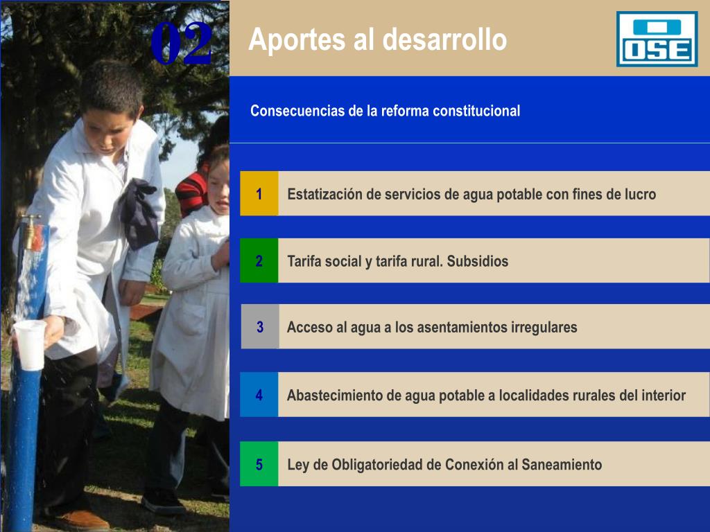 02 Aportes al desarrollo Consecuencias de la reforma constitucional 1 Estatización de servicios de agua potable con fines de lucro 2 Tarifa social y tarifa rural. Subsidios 3 Acceso al agua a los asentamientos irregulares 4 Abastecimiento de agua potable a localidades rurales del interior 5 Ley de Obligatoriedad de Conexión al Saneamiento