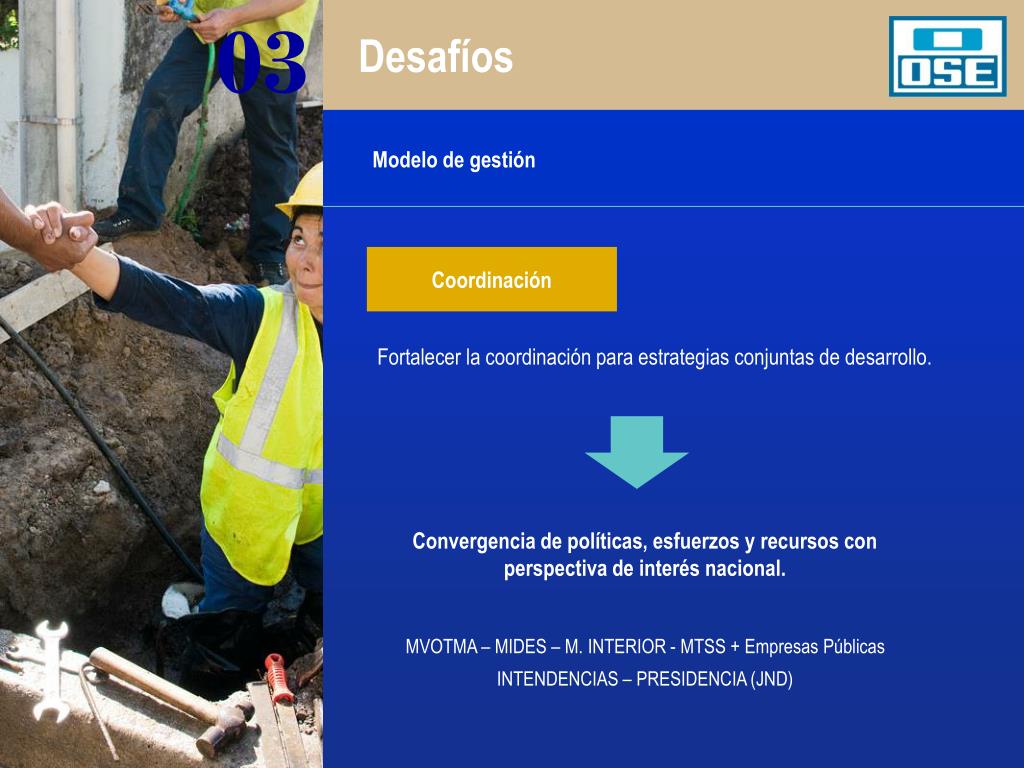 03 Desafíos Modelo de gestión Coordinación • Fortalecer la coordinación para estrategias conjuntas de desarrollo. • Convergencia de políticas, esfuerzos y recursos con perspectiva de interés nacional. • MVOTMA – MIDES – M. INTERIOR - MTSS + Empresas Públicas • INTENDENCIAS – PRESIDENCIA (JND)