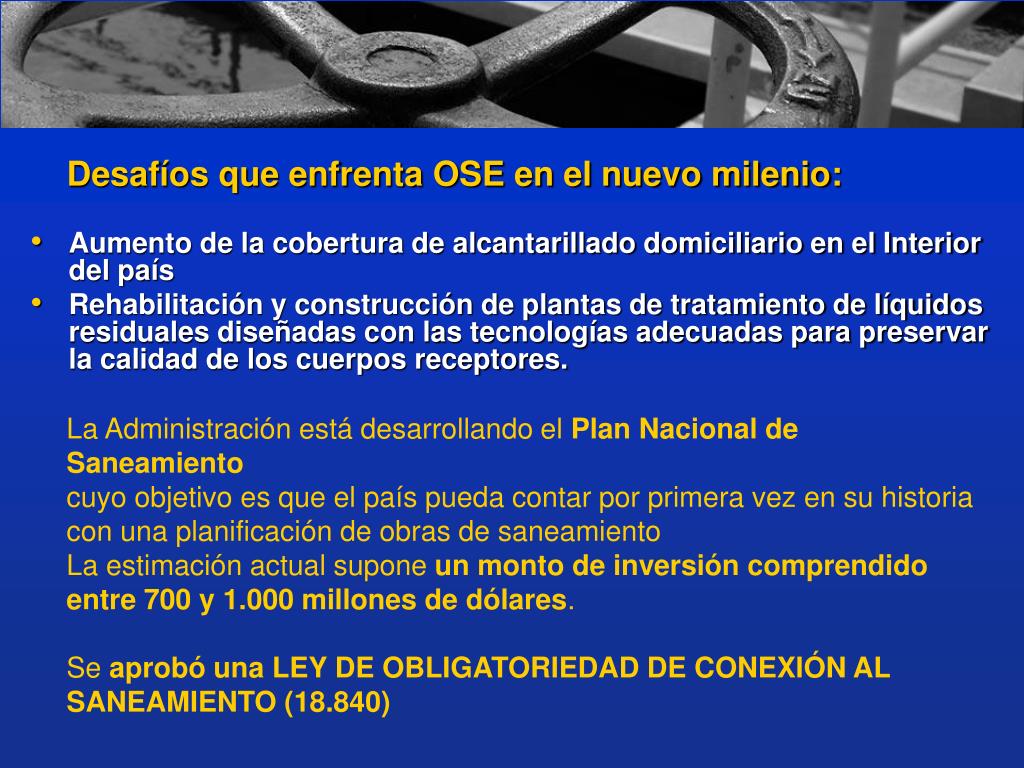 Desafíos que enfrenta OSE en el nuevo milenio: • Aumento de la cobertura de alcantarillado domiciliario en el Interior del país • Rehabilitación y construcción de plantas de tratamiento de líquidos residuales diseñadas con las tecnologías adecuadas para preservar la calidad de los cuerpos receptores. La Administración está desarrollando el Plan Nacional de Saneamiento cuyo objetivo es que el país pueda contar por primera vez en su historia con una planificación de obras de saneamiento La estimación actual supone un monto de inversión comprendido entre 700 y 1.000 millones de dólares. Se aprobó una LEY DE OBLIGATORIEDAD DE CONEXIÓN AL SANEAMIENTO (18.840)