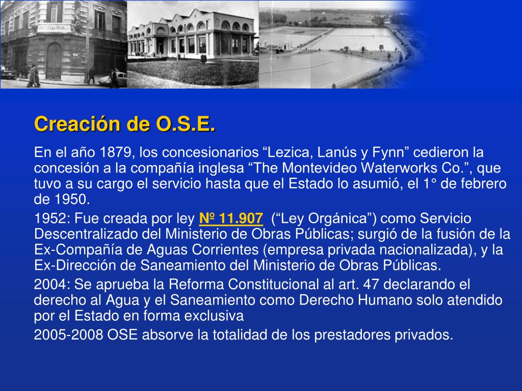 Creación de O.S.E. En el año 1879, los concesionarios “Lezica, Lanús y Fynn” cedieron la concesión a la compañía inglesa “The Montevideo Waterworks Co.”, que tuvo a su cargo el servicio hasta que el Estado lo asumió, el 1° de febrero de 1950. 1952: Fue creada por ley Nº 11.907 (“Ley Orgánica”) como Servicio Descentralizado del Ministerio de Obras Públicas; surgió de la fusión de la Ex-Compañía de Aguas Corrientes (empresa privada nacionalizada), y la Ex-Dirección de Saneamiento del Ministerio de Obras Públicas. 2004: Se aprueba la Reforma Constitucional al art. 47 declarando el derecho al Agua y el Saneamiento como Derecho Humano solo atendido por el Estado en forma exclusiva 2005-2008 OSE absorve la totalidad de los prestadores privados.