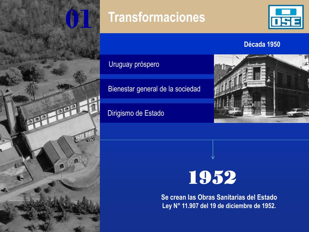 01 Transformaciones Década 1950 Uruguay próspero Bienestar general de la sociedad Dirigismo de Estado 1952 Se crean las Obras Sanitarias del Estado Ley N° 11.907 del 19 de diciembre de 1952.