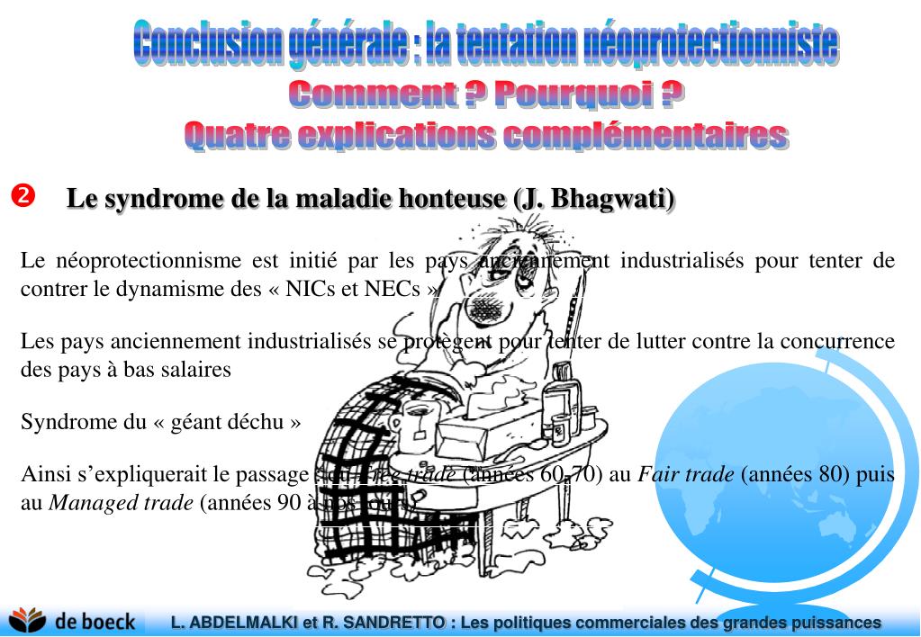 Conclusion générale : la tentation néoprotectionniste Comment ? Pourquoi ? Quatre explications complémentaires Le syndrome de la maladie honteuse (J. Bhagwati) Le néoprotectionnisme est initié par les pays anciennement industrialisés pour tenter de contrer le dynamisme des « NICs et NECs » Les pays anciennement industrialisés se protègent pour tenter de lutter contre la concurrence des pays à bas salaires Syndrome du « géant déchu » Ainsi s’expliquerait le passage : du Free trade (années 60-70) au Fair trade (années 80) puis au Managed trade (années 90 à nos jours) L. ABDELMALKI et R. SANDRETTO : Les politiques commerciales des grandes puissances