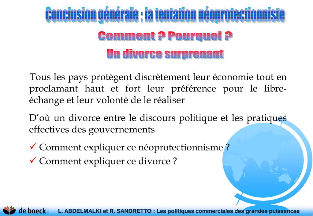 Conclusion générale : la tentation néoprotectionniste Comment ? Pourquoi ? Un divorce surprenant Tous les pays protègent discrètement leur économie tout en proclamant haut et fort leur préférence pour le libre-échange et leur volonté de le réaliser D’où un divorce entre le discours politique et les pratiques effectives des gouvernements ü Comment expliquer ce néoprotectionnisme ? ü Comment expliquer ce divorce ? L. ABDELMALKI et R. SANDRETTO : Les politiques commerciales des grandes puissances
