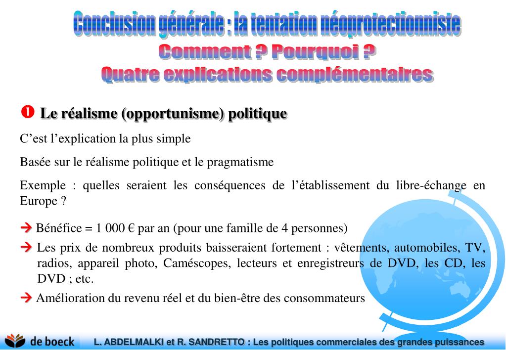 Conclusion générale : la tentation néoprotectionniste Comment ? Pourquoi ? Quatre explications complémentaires ŒLe réalisme (opportunisme) politique C’est l’explication la plus simple Basée sur le réalisme politique et le pragmatisme Exemple : quelles seraient les conséquences de l’établissement du libre-échange en Europe ? àBénéfice = 1000 € par an (pour une famille de 4 personnes) àLes prix de nombreux produits baisseraient fortement : vêtements, automobiles, TV, radios, appareil photo, Caméscopes, lecteurs et enregistreurs de DVD, les CD, les DVD ; etc. àAmélioration du revenu réel et du bien-être des consommateurs L. ABDELMALKI et R. SANDRETTO : Les politiques commerciales des grandes puissances