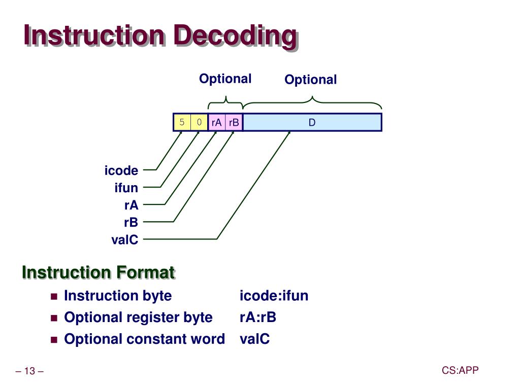Optional Optional D icode 5 0 rA rB ifun rA rB valC Instruction Decoding • Instruction Format • Instruction byte icode:ifun • Optional register byte rA:rB • Optional constant word valC