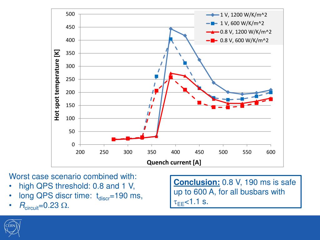 Worst case scenario combined with: • high QPS threshold: 0.8 and 1 V, • long QPS discr time: tdiscr=190 ms, • Rcircuit=0.23 W. Conclusion: 0.8 V, 190 ms is safeup to 600 A, for all busbars with tEE<1.1 s.