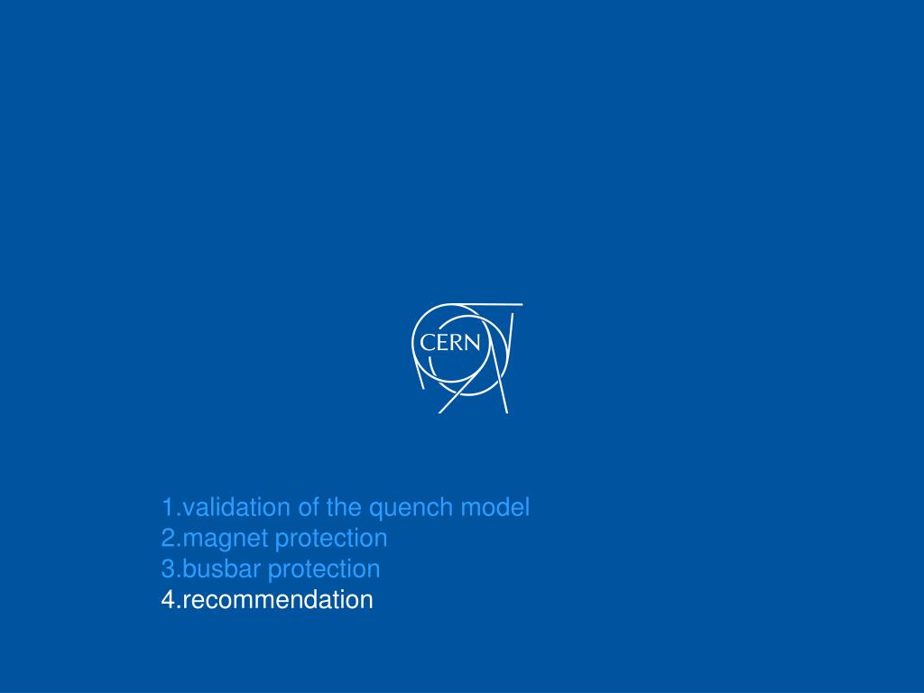 validation of the quench model • magnet protection • busbarprotection • recommendation