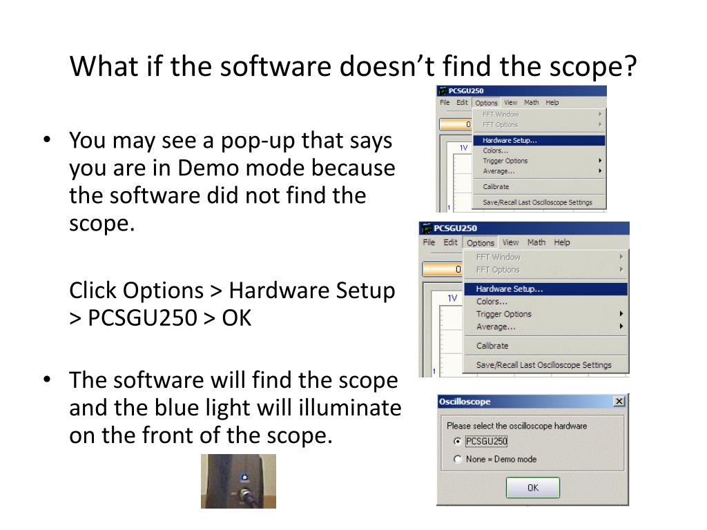 What if the software doesn’t find the scope? • You may see a pop-up that says you are in Demo mode because the software did not find the scope. Click Options > Hardware Setup > PCSGU250 > OK • The software will find the scope and the blue light will illuminate on the front of the scope.