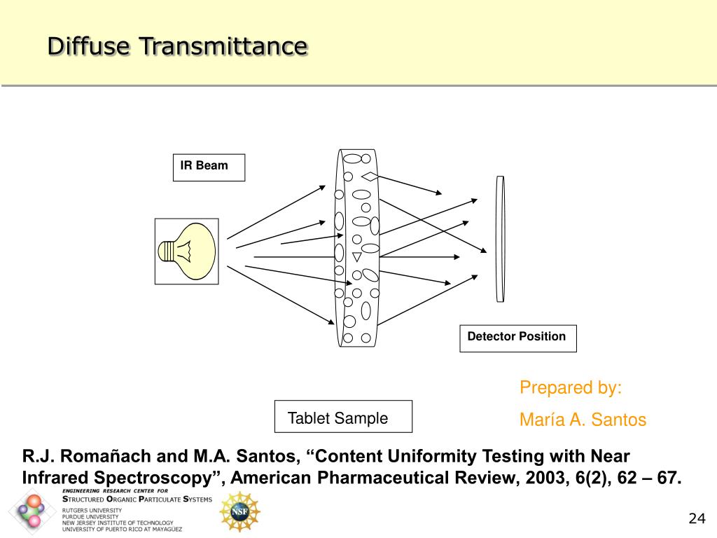 IR Beam Detector Position Diffuse Transmittance Prepared by: María A. Santos Tablet Sample R.J. Romañach and M.A. Santos, “Content Uniformity Testing with Near Infrared Spectroscopy”, American Pharmaceutical Review, 2003, 6(2), 62 – 67.