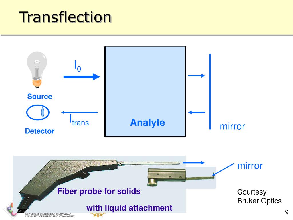 I0 Source Itrans Detector Transflection Analyte mirror mirror Fiber probe for solids Courtesy Bruker Optics with liquid attachment