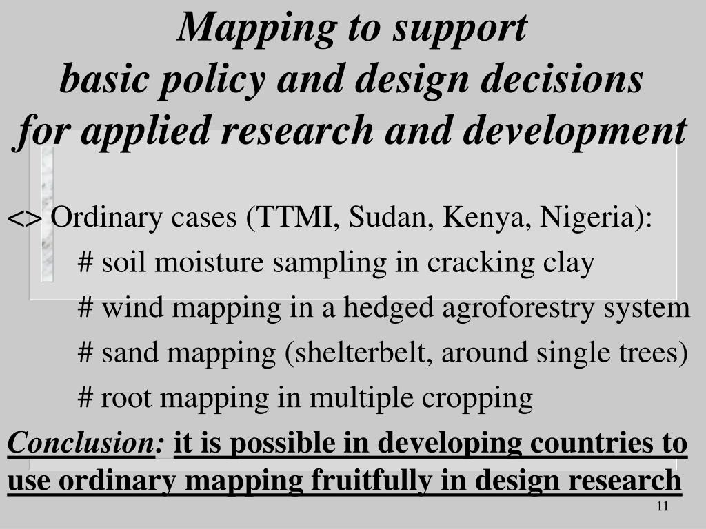 Mapping to support basic policy and design decisions for applied research and development <> Ordinary cases (TTMI, Sudan, Kenya, Nigeria): # soil moisture sampling in cracking clay # wind mapping in a hedged agroforestry system # sand mapping (shelterbelt, around single trees) # root mapping in multiple cropping Conclusion: it is possible in developing countries to use ordinary mapping fruitfully in design research