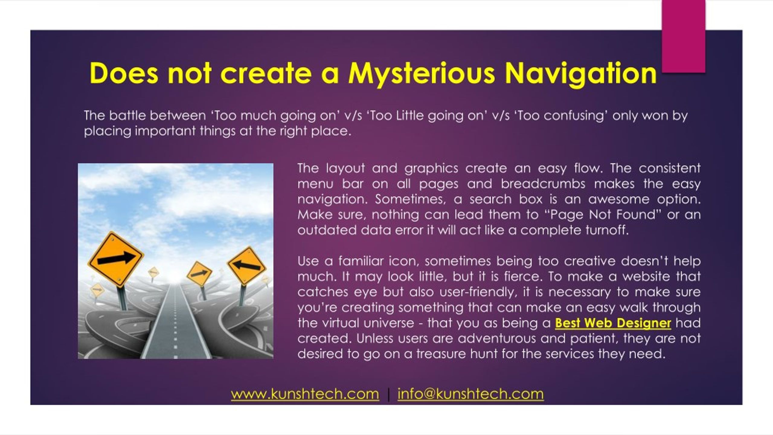 Does not create a Mysterious Navigation The battle between ‘Too much going on’ v/s ‘Too Little going on’ v/s ‘Too confusing’ only won by placing important things at the right place. The layout and graphics create an easy flow. The consistent menu bar on all pages and breadcrumbs makes the easy navigation. Sometimes, a search box is an awesome option. Make sure, nothing can lead them to “Page Not Found” or an outdated data error it will act like a complete turnoff. Use a familiar icon, sometimes being too creative doesn’t help much. It may look little, but it is fierce. To make a website that catches eye but also user-friendly, it is necessary to make sure you’re creating something that can make an easy walk through the virtual universe - that you as being a Best Web Designer had created. Unless users are adventurous and patient, they are not desired to go on a treasure hunt for the services they need. www.kunshtech.com | info@kunshtech.com