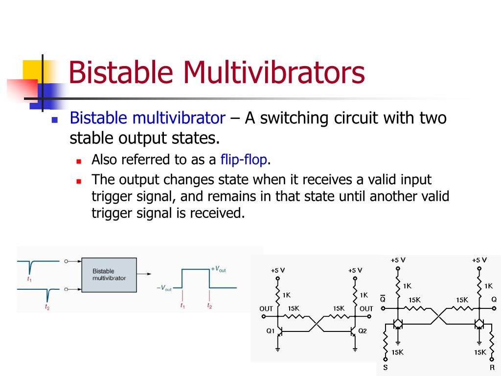 Bistable Multivibrators • Bistable multivibrator – A switching circuit with two stable output states. • Also referred to as a flip-flop. • The output changes state when it receives a valid input trigger signal, and remains in that state until another valid trigger signal is received.